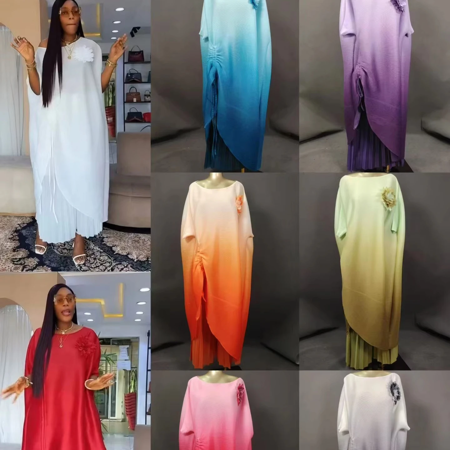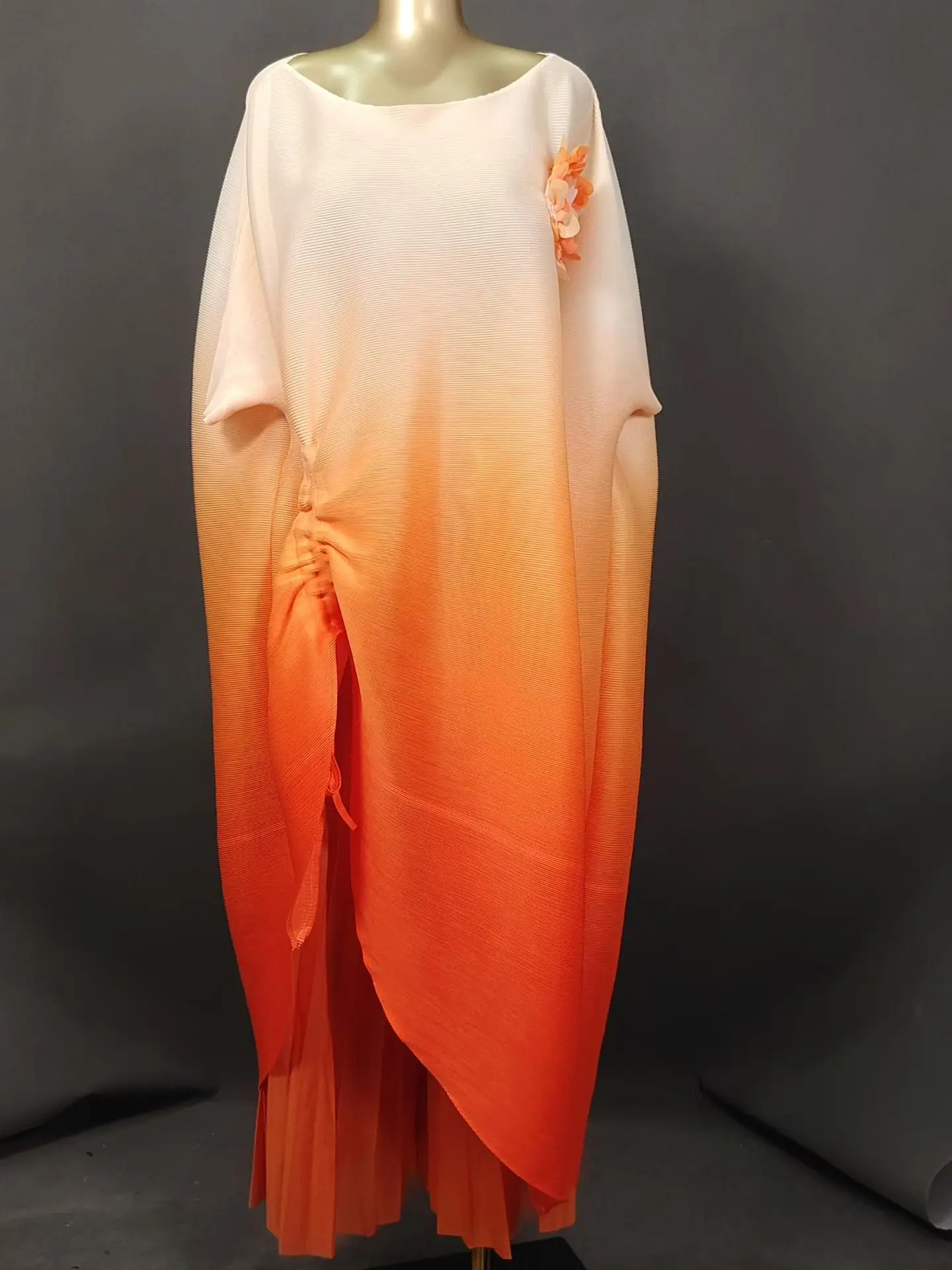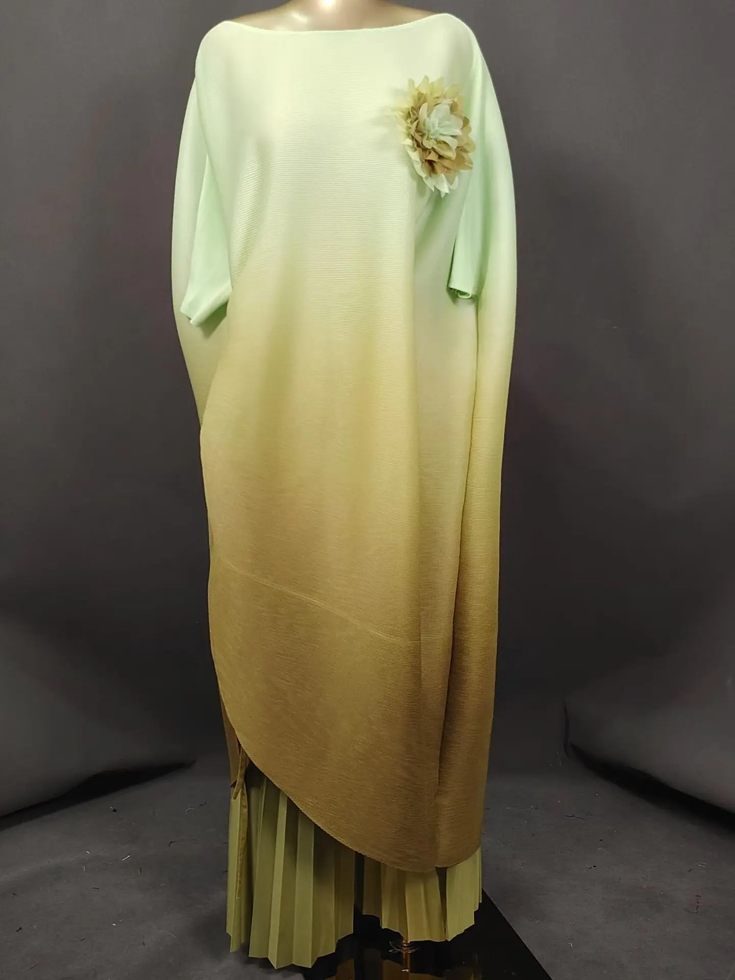 2025 Wholesale Miyake Elegant High Quality Plus Size Womens Pleated Clothing Half Sleeve Gradient Flowers 2 Piece Pants Set